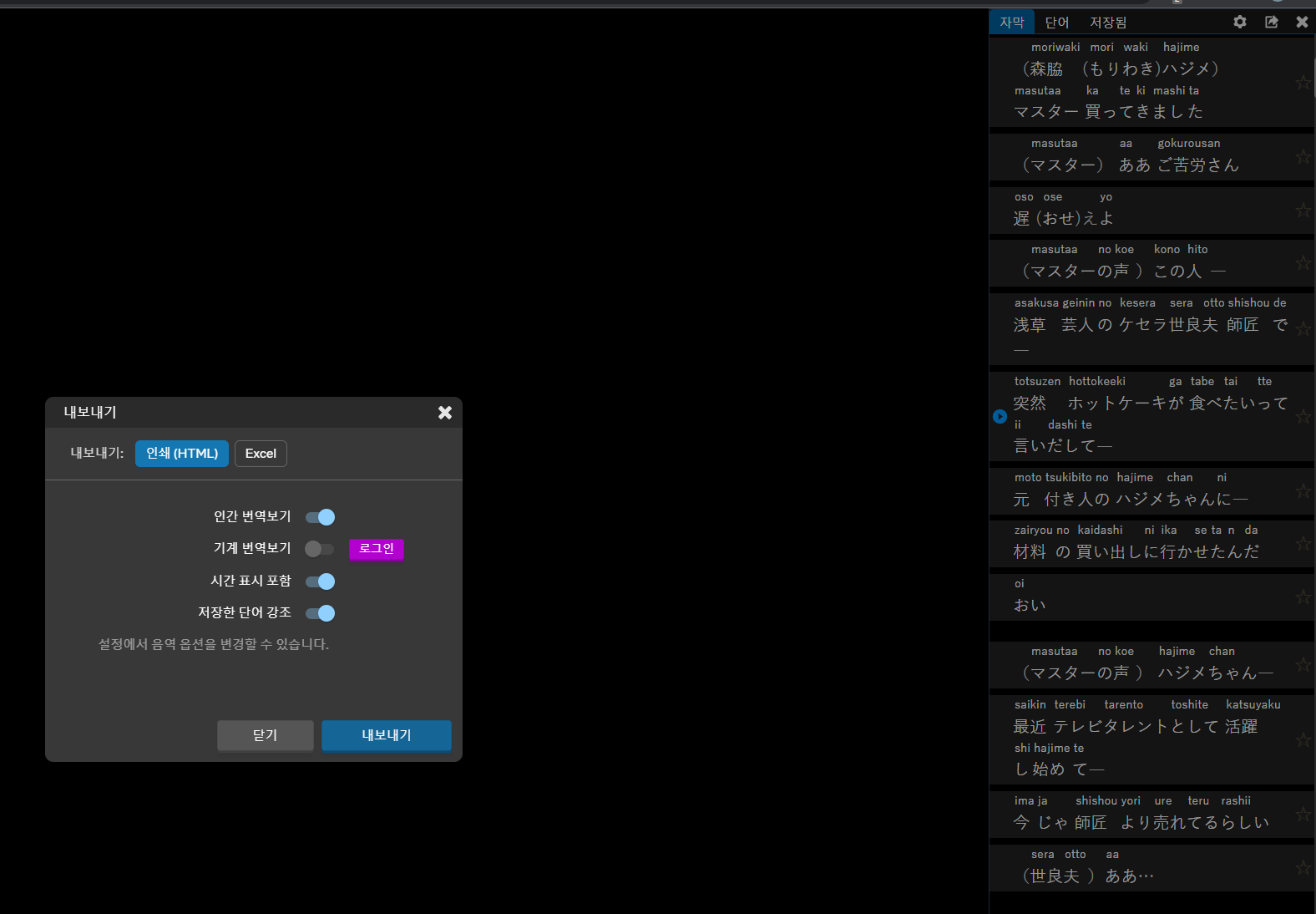 우측 상단의 설정 옆의 화살표를 누르면 대본을 내보낼 수 있다.